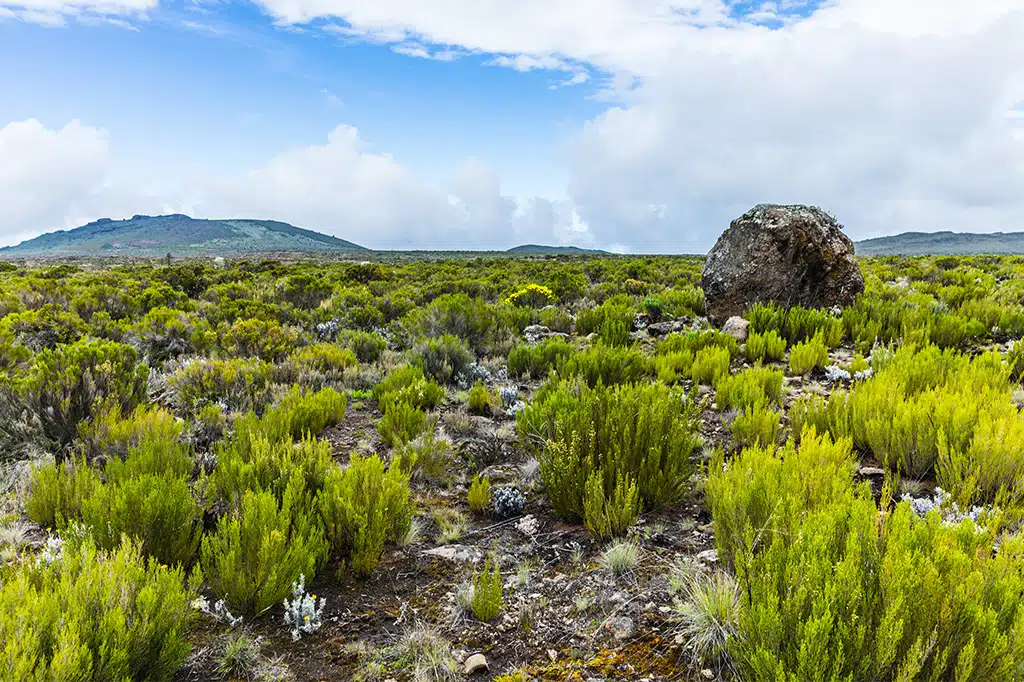 Ascend gradually to open moorland, reach Shira 1 Camp.